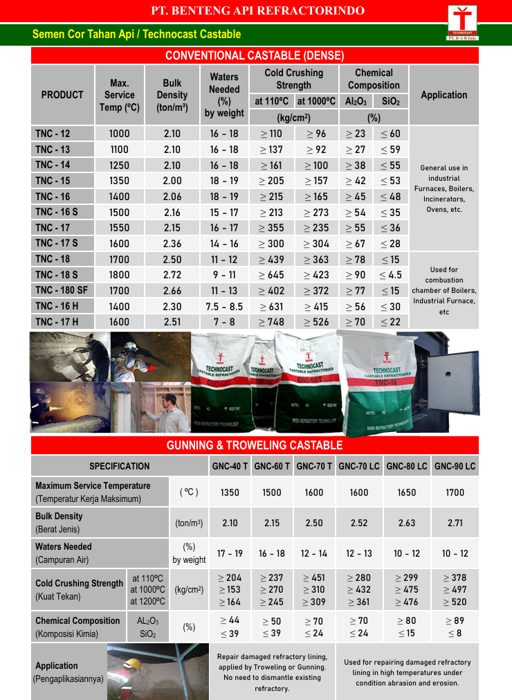 PT Benteng Api Refractorindo memproduksi Castable C18 atau Technocast Castable TNC-18 adalah jenis material refractory dengan kadar alumina tinggi. Material refractory ini masuk kedalam kategori Monolithic Refractory, yaitu material tahan api yang belum terbentuk dan dalam pemakaiannya perlu dilakukan proses pembentukan atau pencampuran bahan lain seperti air bersih terlebih dahulu. Castable ini merupakan jenis semen cor tahan api yang digunakan untuk pemasangan pada Boiler, Furnace, Kiln, Incinerator, Reactor, maupun keperluan pekerjaan cor tahan api lainnya.